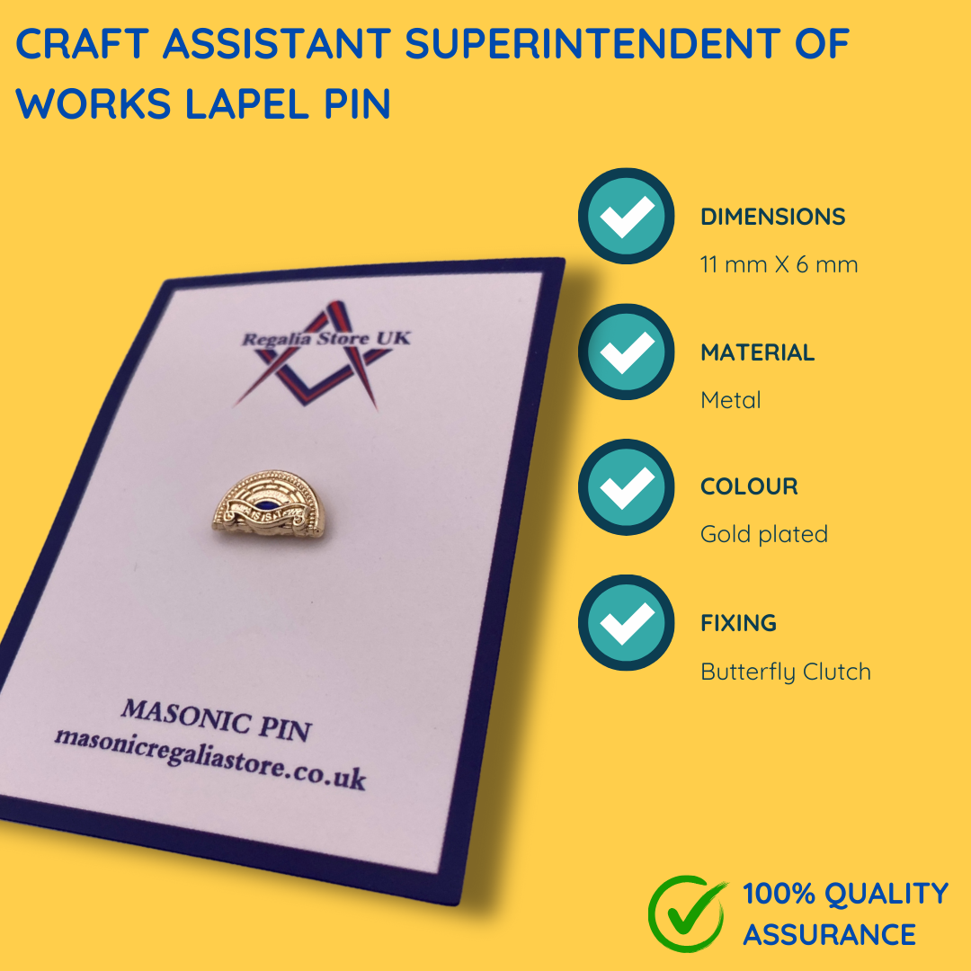 The Craft Provincial Assistant Superintendent of Works Lapel Pin is a premium-quality, gold-plated lapel pin designed for provincial officers to proudly display their rank within any Masonic provincial lodge. Crafted with precision, this elegant pin is made from high-grade metal and features a secure butterfly clutch for easy attachment.