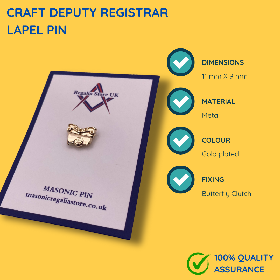 The Craft Provincial Deputy Registrar Lapel Pin is a meticulously crafted, gold-plated accessory designed for provincial officers within the Masonic lodge. This elegant pin symbolizes rank and dedication, making it a distinguished addition to any Mason’s attire. Its premium quality metal construction and secure butterfly clutch ensure durability and comfort.