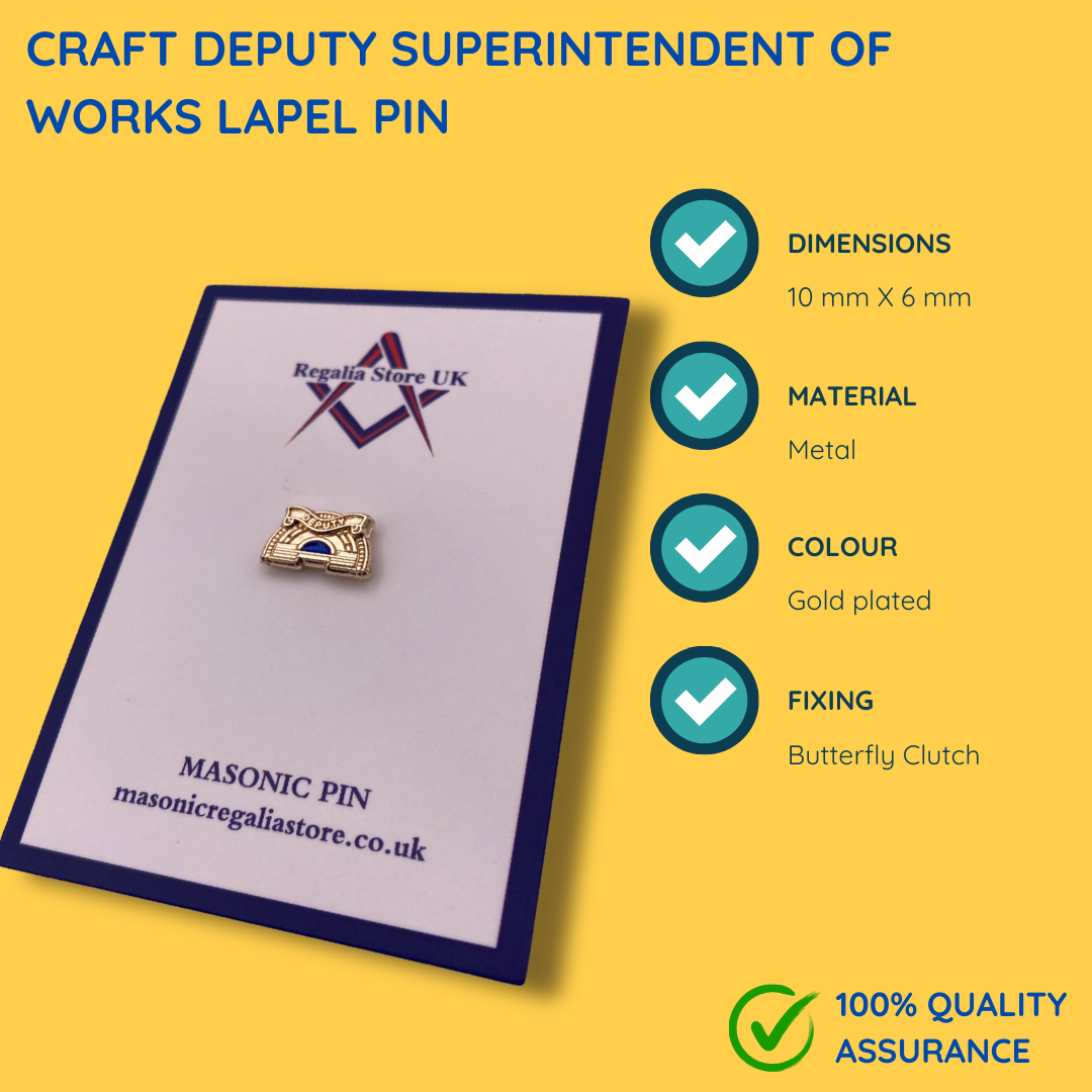 The Craft Provincial Deputy Superintendent of Works Lapel Pin is a distinguished and elegant accessory designed for provincial officers within the Masonic lodge. Crafted with precision, this lapel pin symbolizes rank and dedication, making it a meaningful representation of achievement and responsibility. Made from high-quality metal and finished with a flawless gold plating, this pin is both durable and visually striking. Its compact size (10mm x 6mm) ensures it complements any attire without being overly conspicuous. Fitted with a secure butterfly clutch, the pin is easy to wear and stays firmly in place. Whether worn during formal lodge meetings or gifted to a fellow Mason, this lapel pin is a timeless and valuable addition to any Freemason’s collection
