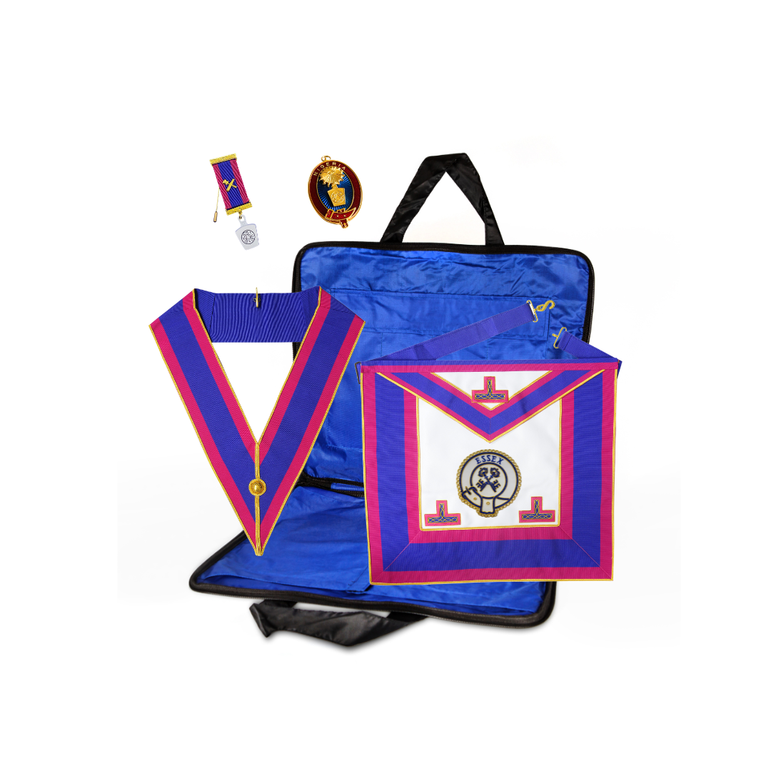 Manufactured with high quality soft and crisp leather or imitation leather, blue moire watermarked ribbon, blue rosettes, golden slim braid and backside finished with sleek quality dark blue cordura fabric. There is a pocket at the back of apron. Apron belt is waist adjustable up to 46 inches. Size of the apron is 14 X 16 inches. The apron is for brethren who is having provincial honours without previously having been Master of a lodge.