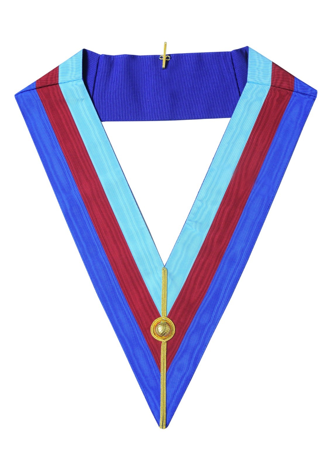 Finest quality Royal Arch Chapter Grand collar manufactured with tri-coloured 4 inches wide moire watermarked ribbon and golden slim braid. There are golden chromed swivel hook and clip at the rear of collar.